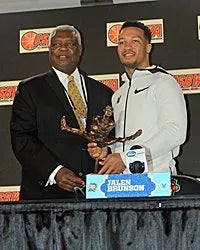 Oscar Robertson presents the 2018 Oscar Robertson Trophy to Jalen Brunson, Villanova junior guard who becomes the second U.S. Basketball Writers Association player of the year from the Big East Conference in the past five years. Doug McDermott of Creighton won the award in 2014. (Photo courtesy of USBWA.)
