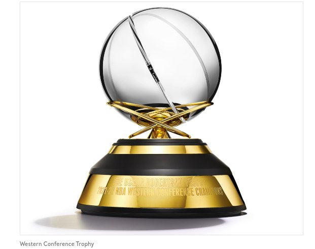 Part of the new unveiling was a redesign of the trophy.The 15.6-inch trophy is designed by Victor Solomon and Tiffany & Co. and features two raised rings supporting a basketball made of sterling silver. As explained in the 2022 NBA press release, the parts of the basketball represent four key milestones achieved by a Western Conference team toward the NBA Finals: Playoffs, First Rund, Conference Semifinals, and Conference Finals.